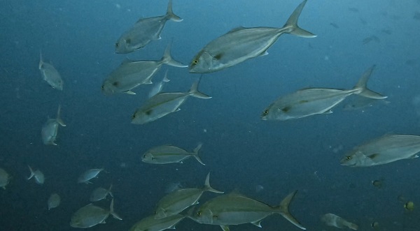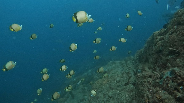 お盆連休初日は久しぶりに風も弱まりボート出船できる海況となりました!青空も見えつつ、潜ると視界はまずまず良好♪ですが、水深10mくらいから水温19℃台に💦キレイだけど極端に冷たい潮が安良里にも入っていました。魚も暖かいエリアを好み上層にまとまっており、「沖の根」ではイワシの群れにチビワラサやカンパチも回ってきて迫力満点でした!イサキ、イスズミ、コロダイ、マダイ、シラコダイなどたくさん群れていました🐟明日は予報が良くありませんが、安全第一に潜れる海を楽しんでいきましょう!!